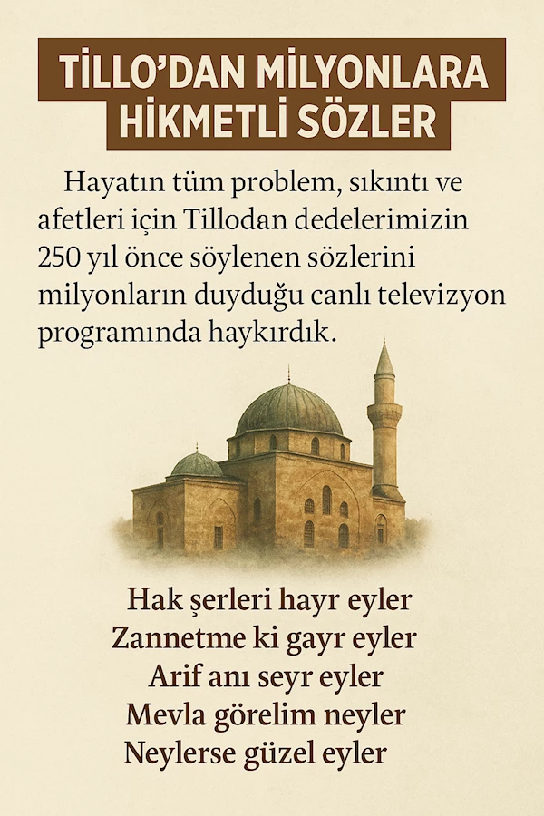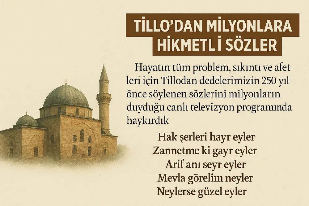Milyonların izlediği canlı televizyon programında, Tillo'nun manevi büyüklerinin asırlardır dillerde dolaşan hikmet dolu sözleri bir kez daha yankı buldu. 250 yıl önce Tillo'da söylenen ve insanlara sabrı, teslimiyeti ve hikmeti öğütleyen bu derin dizeler, günümüzün zorlu koşullarında hala yol göstermeye devam ediyor.
