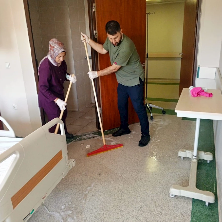 Temizlik çalışmalarında görevli ekipler, özellikle enfeksiyon riskinin azaltılması ve hastane ortamında hijyen standartlarının üst seviyeye çıkarılması adına yoğun çaba sarf etti.