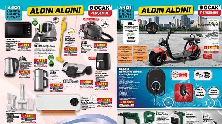 A101'in 9 Ocak Perşembe günü satışa sunacağı aktüel ürünler kataloğu belli oldu. Televizyon, beyaz eşya, koltuk yıkama makinesi, çay makinesi, blender seti ve elektrikli süpürge gibi teknolojik ürünlerin yanı sıra mutfak gereçleri, oyuncaklar, deterjanlar, gıda ürünleri ve atıştırmalıklar da cazip fiyatlarla tüketicilerle buluşacak. İşte bu haftanın dikkat çeken A101 indirimleri!