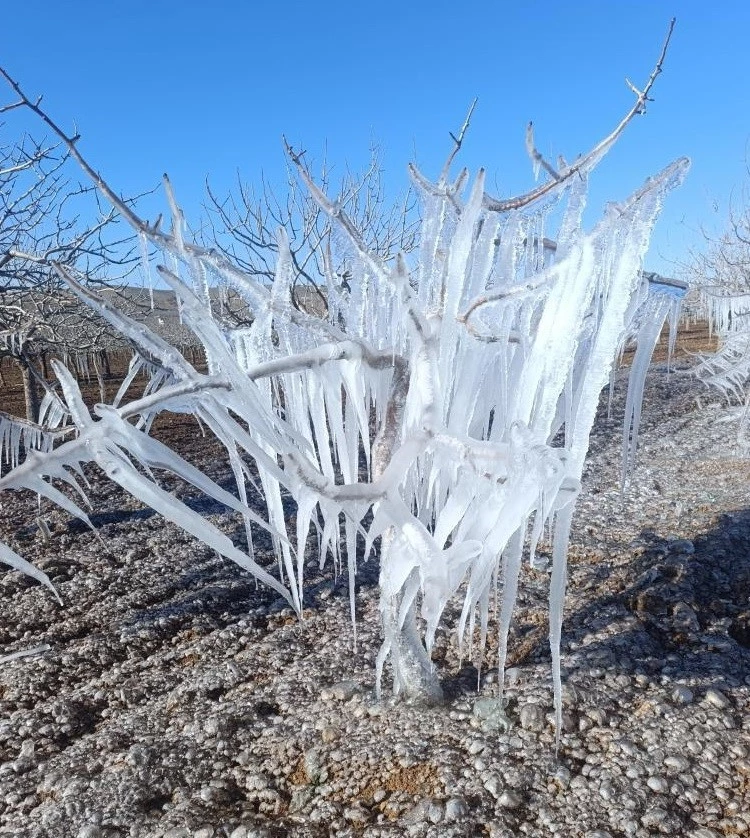 Hava sıcaklıklarının eksi dereceleri gördüğü Adıyaman’da fıstık bahçeleri buz tuttu.