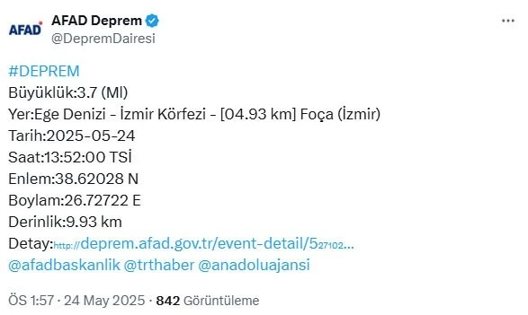 Afet ve Acil Durum Yönetimi Başkanlığı (AFAD), İzmir Körfezi’nde saat 13.52’de 3.7 büyüklüğünde bir deprem meydana geldiğini duyurdu. Depremin merkez üssü Ege Denizi’nde, derinliği ise yaklaşık 9,93 kilometre olarak kaydedildi. İzmir’de hissedilen deprem, kısa süreli paniğe yol açtı.