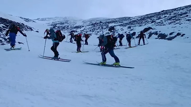 Ağrı Dağı’na tırmanış için gelen bir grup dağcı, zirveye tırmanırken dağın eteklerinde kayak yaparak yolculuklarına renk kattı.