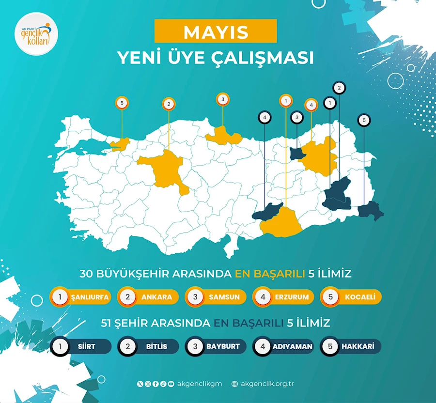 AK Parti Gençlik Kolları Genel Merkezi tarafından hazırlanan haritaya göre, Mayıs ayının en başarılı 5 ili şu şekilde sıralandı: