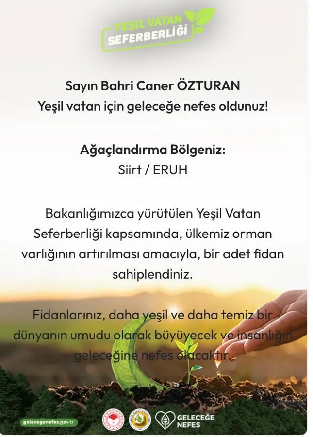 Cumhurbaşkanı Recep Tayyip Erdoğan’ın öncülüğünde başlatılan “Yeşil Vatan Seferberliği” kapsamında ülke genelinde yürütülen ağaçlandırma çalışmaları devam ediyor. Bu kapsamda, Av. Bahri Caner Özturan da doğaya duyarlılığını göstererek Siirt’in Eruh ilçesinde bir fidan sahiplenerek kampanyaya katıldı.