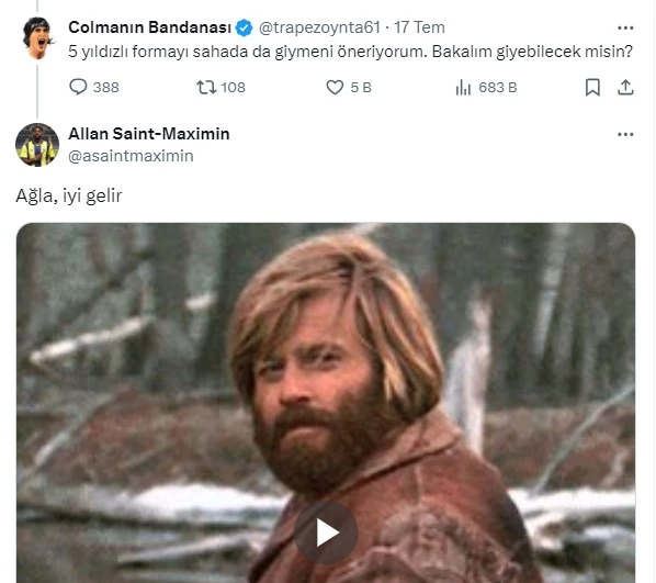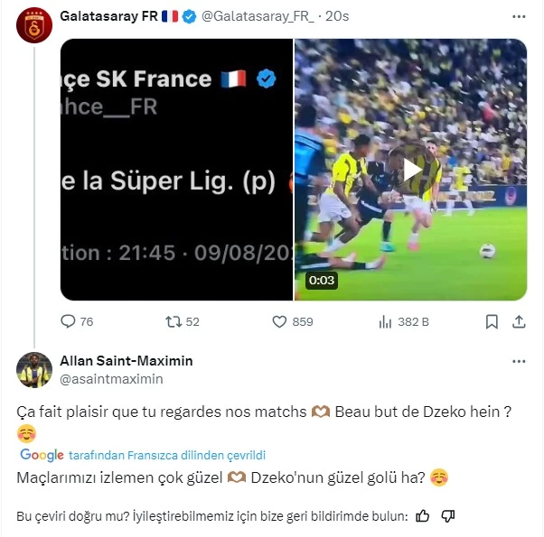 Fenerbahçe'nin Adana Demirspor'u 1-0 yendiği maçta Edin Dzeko'nun galibiyet golünün asistini yapan sarı-lacivertlilerin yeni transferi Allan Saint-Maximin, sosyal medyada Galatasaray taraftarıyla karşı karşıya geldi. Sarı-kırmızılı bir taraftarın Jayden Oosterwolde'nin kırmızı kart görmesi gerektiği yönünde paylaşımını gören Maximin, ''Maçlarımızı izlemen çok güzel. Dzeko'nun golü güzeldi değil mi?'' yanıtını verdi.
