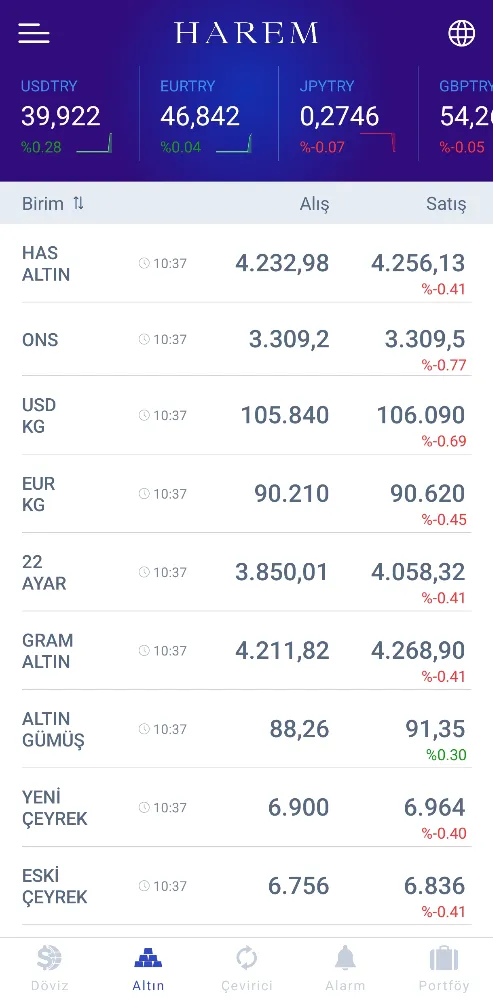 Harem Finans’ın 07 Temmuz 2025 saat 10:37 itibarıyla yayımladığı verilere göre, hem altın hem de döviz kurlarında sınırlı değişimler gözlemleniyor.