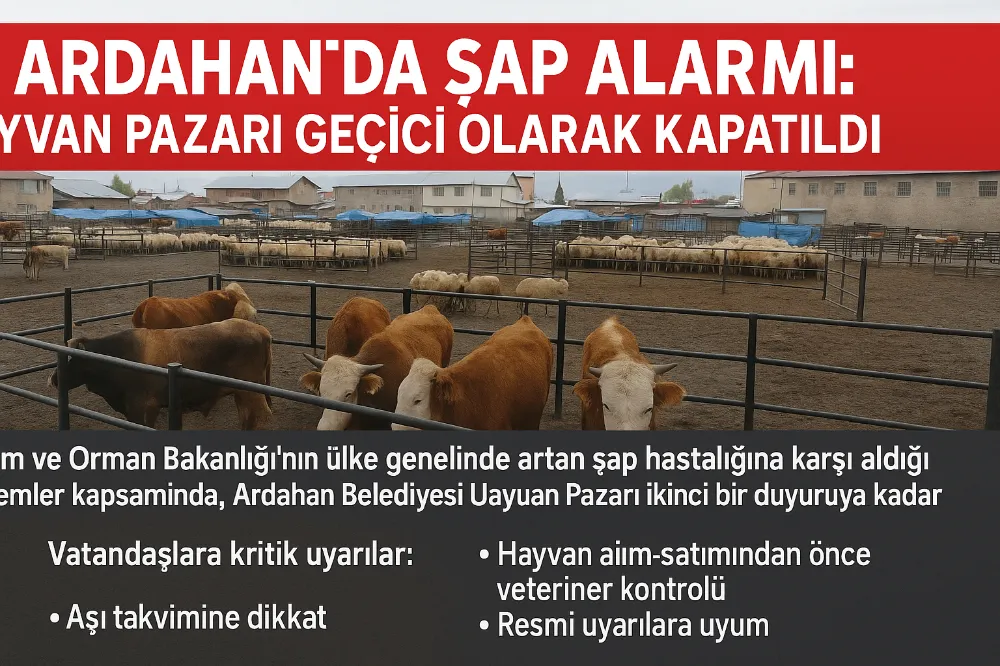 “Ülkemiz genelinde görülen şap hastalığına karşı alınan önlemler kapsamında, Ardahan Belediyesi Hayvan Pazarı, Tarım ve Orman Bakanlığı’nın kararı doğrultusunda ikinci bir duyuruya kadar geçici olarak kapatılmıştır. Vatandaşlarımızın hayvan hareketlerine karşı daha dikkatli olmaları ve resmi makamlarca yapılacak uyarıları dikkate almaları önem arz etmektedir.”