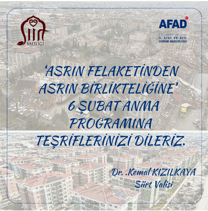 Türkiye tarihine “asrın felaketi” olarak geçen 6 Şubat 2023 depremlerinin yıl dönümünde, Siirt’te anlamlı ve kapsamlı bir anma programı düzenleniyor. Siirt Valiliği koordinesinde, AFAD başta olmak üzere ilgili tüm kamu kurumları, güvenlik birimleri ve sivil toplum kuruluşlarının katılımıyla gerçekleştirilecek program, “Asrın Felaketinden Asrın Birlikteliğine” temasıyla toplumsal dayanışmayı ve ortak hafızayı güçlendirmeyi amaçlıyor.
