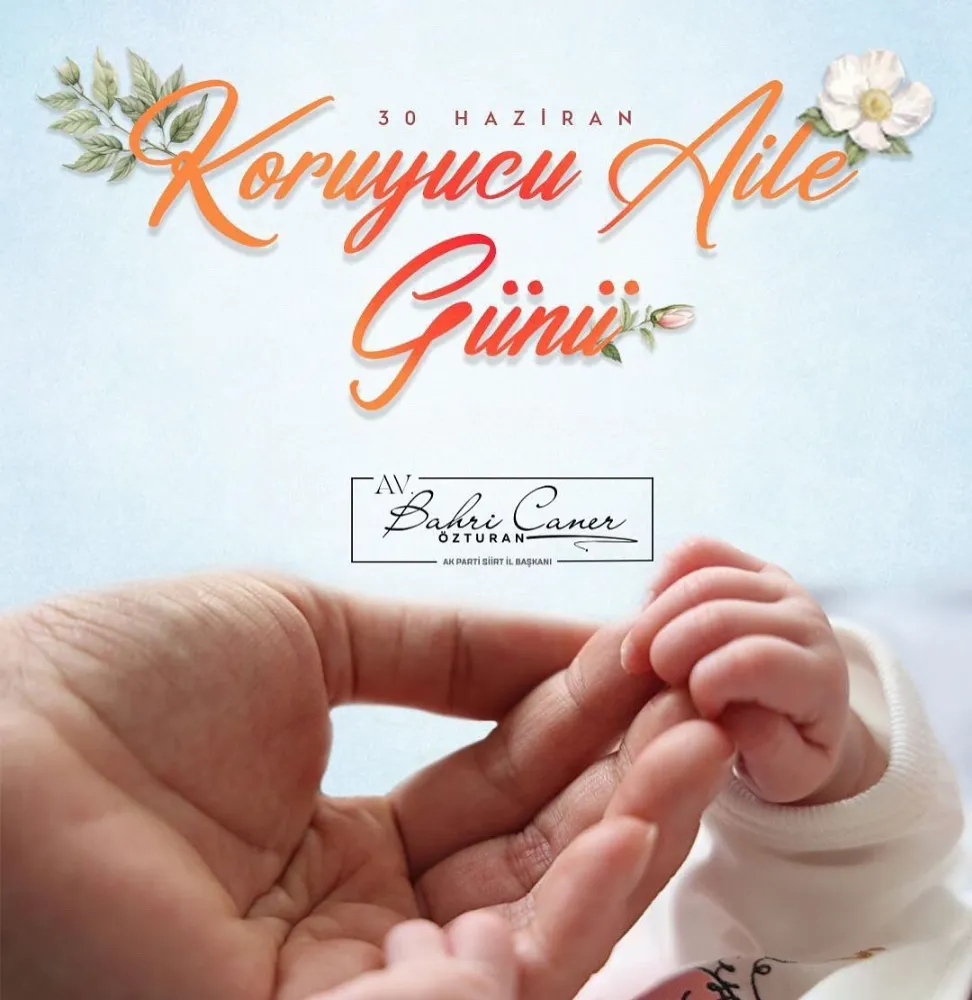 30 Haziran Koruyucu Aile Günü dolayısıyla AK Parti Siirt İl Başkanı Av. Bahri Caner Özturan, yayınladığı anlamlı mesajla koruyucu aileliğin önemine dikkat çekti. Toplumun en kıymetli hazinesi olan çocukların sağlıklı bireyler olarak yetişmesinde koruyucu ailelerin rolünün hayati olduğuna vurgu yaptı.