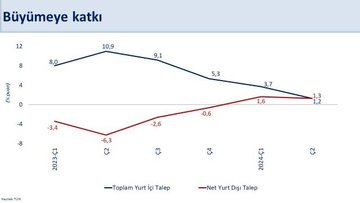 dış kaynak girişleri arttı, rezervler iyileşti ve dezenflasyon sürecine girdik. Bugün açıklanan ikinci çeyrek büyüme verilerine göre iç talebin büyümeye katkısı 1,2 puana gerilerken, net dış talebin pozitif katkısı 1,3 puan oldu.