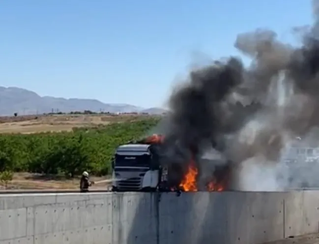 Olay, saat 15.30 sıralarında Malatya Havalimanı yolu üzerindeki Bindal Kavşağı mevkiinde meydana geldi. Edinilen bilgilere göre, seyir halindeki bir tırın lastiği patladı. Kontrolden çıkan araç, yol kenarındaki bariyerlere çarptı. Çarpmanın etkisiyle araç bir anda alev alırken, olay yerine itfaiye ekipleri sevk edildi. Kısa sürede büyüyen yangın, aracın tamamını sardı. Tır tamamen yanarak kullanılamaz hale gelirken, sürücü kazayı yara almadan atlattı. Ekiplerin müdahalesi sonucu yangın kontrol altına alınarak söndürüldü.