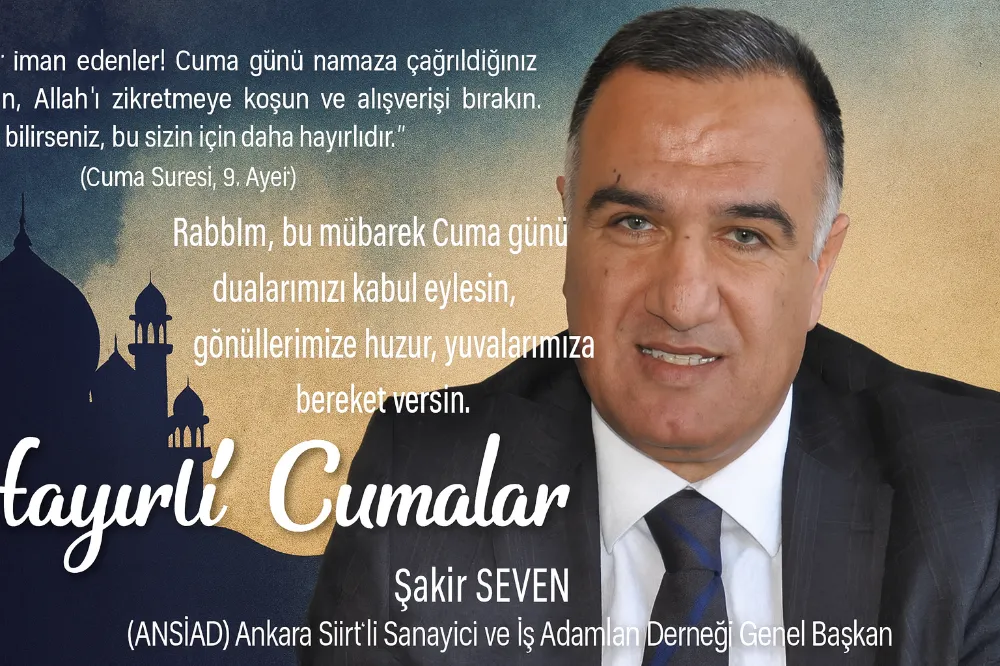 Ankara Siirt’li Sanayici ve İş Adamları Derneği (ANSİAD) Genel Başkanı Şakir Seven, mübarek Cuma günü vesilesiyle anlamlı bir mesaj yayımladı. Seven, hem Kur’an-ı Kerim’den bir ayetle hem de içten temennilerle hemşehrilerine ve tüm Müslümanlara seslendi.