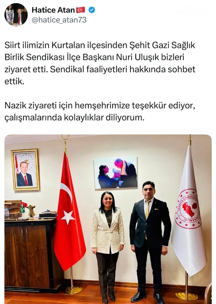 Siirt’in Kurtalan ilçesinden Şehit Gazi Sağlık Birlik Sendikası İlçe Başkanı Nuri Uluşık,sendika ilçe başkanı Ankara’da bir ziyaret gerçekleştirerek sendikal çalışmalar ve sahadaki güncel meseleler hakkında görüşlerini paylaştı. Ziyarette, emek dünyasının beklentileri ve sendikal faaliyetlerin önemi üzerinde duruldu; karşılıklı iyi dilekler iletildi.