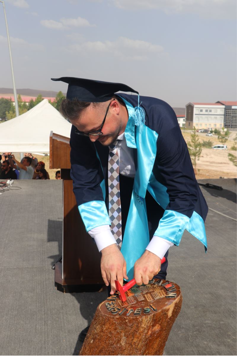 Üniversite birincisi Mehmet Nuri Aydinalp, mezun olan öğrenciler adına konuşma yaptı, mezuniyet kütüğüne plaket çaktı.