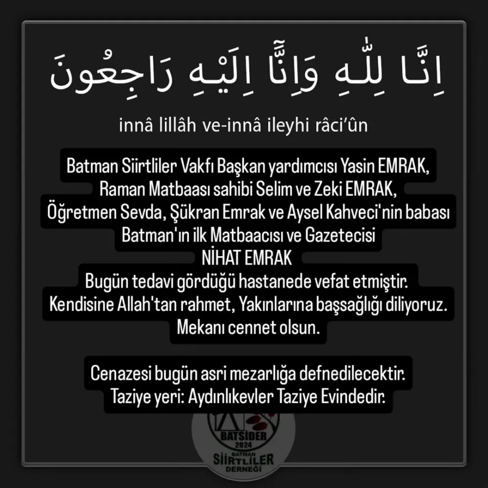 Merhum Nihat Emrak’a Allah’tan rahmet; başta Emrak ailesi olmak üzere, tüm yakınlarına, sevenlerine ve Batman basın camiasına sabır ve başsağlığı diliyoruz.