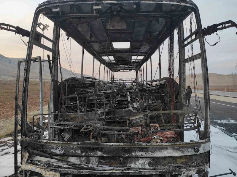 Batman Hasankeyf kara yolunda, seyir halindeyken motor kısmından alev alan yolcu otobüsü, kullanılamaz hale geldi.