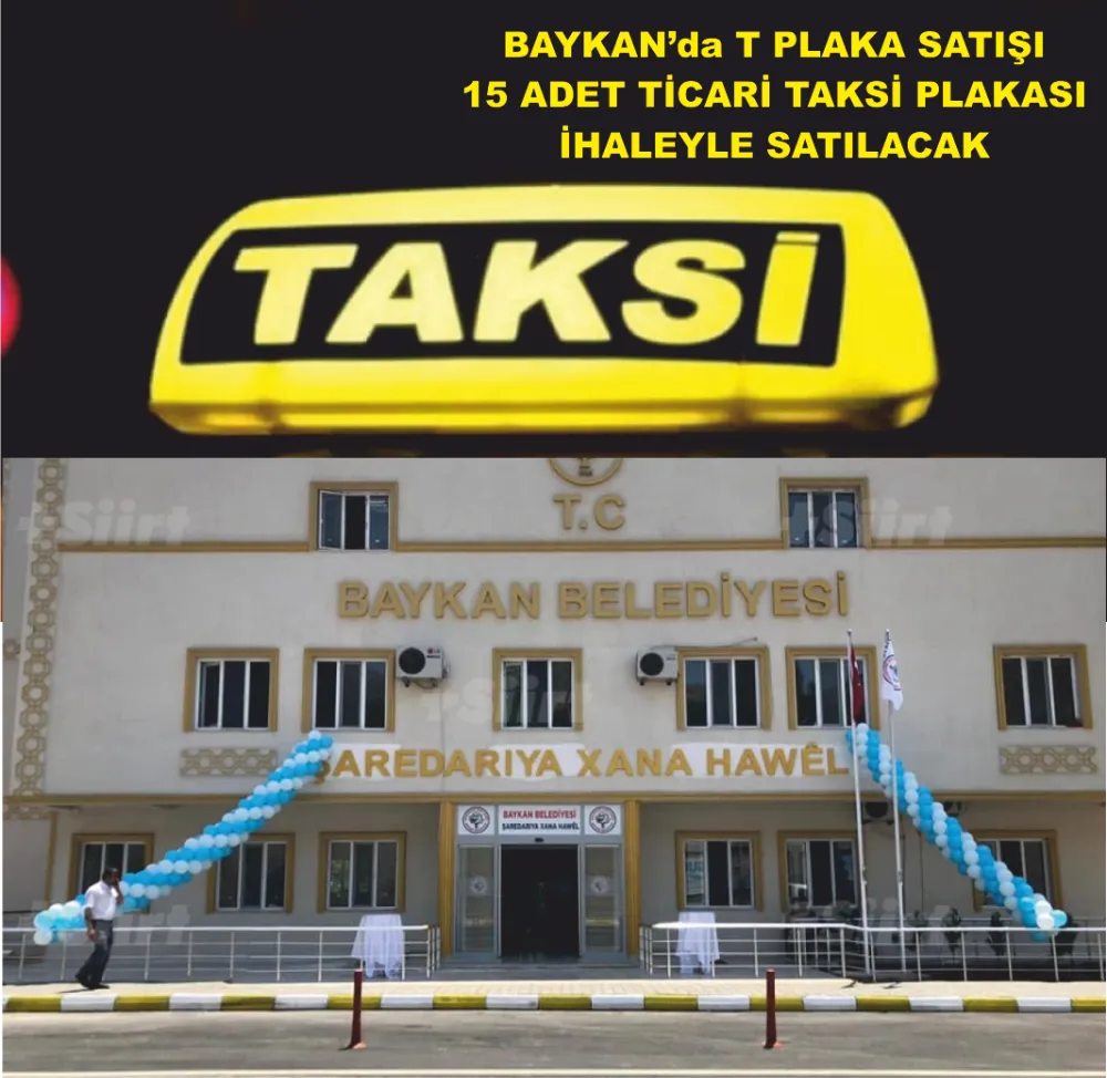 Baykan Belediyesi, ticari taksi plakalarının satışı için ihale düzenleyeceğini duyurdu. İhale, 30 Temmuz saat 14:00'te gerçekleştirilecek.Baykan Belediyesi yayımladığı ilanında , 15 adet ticari taksi plakası muhammen bedel olarak 15.000 TL üzerinden ihaleye çıkarılacak. Şartname bedeli 100 TL olup, ilgilenenler Yazı İşleri Müdürlüğü'nden temin edebilecekler. Şartname bedelinin iade edilmeyeceği belirtilirken, ihaleye katılmak için gerekli belgelerin eksiksiz sunulması gerektiği vurgulandı. İhaleye katılmak isteyenlerden istenen belgeler arasında nüfus cüzdanı fotokopisi, borçsuz olduğunu gösteren belge, son bir yıl içinde Baykan'da ikamet ettiğini gösteren belge ve aracın Baykan Belediyesi T Ticari Taksi İşletme Yönetmeliği'ne uygun olarak en fazla 10 yaşında olduğunu gösteren belge yer alıyor. Daha fazla bilgi almak veya şartname temin etmek isteyenlerin Baykan Belediyesi yazı işleri müdürlüğü ile iletişime geçmeleri gerektiği ifadelerine yer verildi.