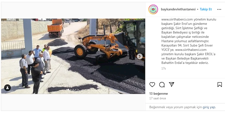 Baykan Devlet Hastanesi yolundan toz ve çamurdan geçilemiyordu. Bu durumun gündeme gelmesiyle birlikte Hastane Yolunda Asfalt çalışmaları tamamlandı. Baykan Devlet Hastanesi sosyal medya hesabından teşekkür mesajı yayımladı. Baykan Devlet Hastanesi sosyal medya hesabından yayımladığı mesajında; Hastanemize gelen yolda meydana gelen toz ve çamura engel olmak amacıyla www.siirthaberci.com yönetim kurulu başkanı Şakir Erol'un gündeme getirdiği, Siirt İşletme Şefliği ve Baykan Belediyesi iş birliği ile başlatılan çalışmalar neticesinde Hastane yolumuz asfaltlanmıştır. Karayolları 94. Siirt Sube Şefi Enver YÜCE'ye, www.siirthaberci.com yönetim kurulu başkanı Şakir EROL'a ve Baykan Belediye Başkanvekili Bahattin Erdal'a teşekkür ederiz. Sözlerine yer verdi.