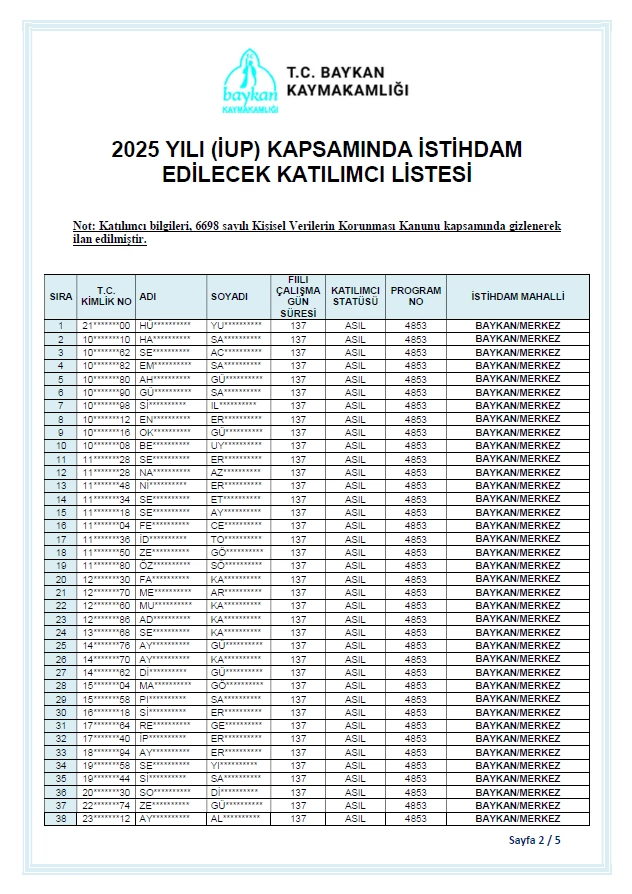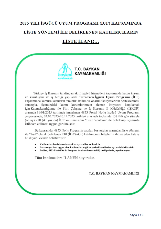 2025 Yılı İşgücü Uyum Programı (İUP) Kapsamında Baykan’da istihdam edilecek katılımcıların listesi açıklandı.
