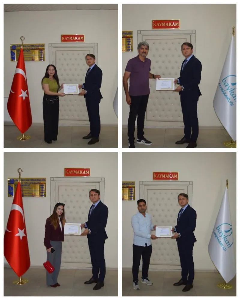 Baykan Kaymakamlığı makamında düzenlenen sade ve anlamlı törende, Kaymakam Fatih Özcan başarılı eğitim personelini tek tek tebrik ederek belge takdiminde bulundu. Eğitimdeki kaliteyi artırmaya yönelik katkılarından dolayı memnuniyetini dile getiren Kaymakam Özcan, personelin gösterdiği azim, disiplin ve sorumluluk bilincinin takdire şayan olduğunu vurguladı.