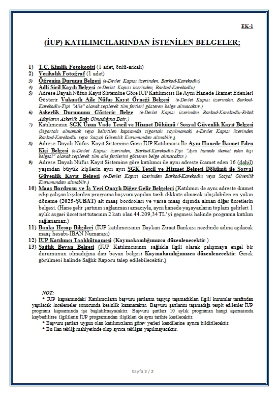 Baykan Kaymakamlığı 2025 yılı işgücü uyum programı (İUP) kapsamında istihdam edilecek katılımcılardan işe giriş öncesi istenilen belgeler aşağıdaki gibidir.