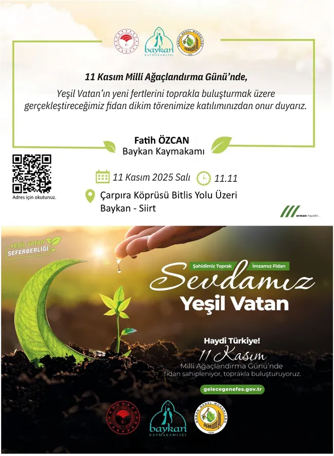 Türkiye genelinde eş zamanlı olarak kutlanan 11 Kasım Milli Ağaçlandırma Günü, bu yıl da Baykan’da büyük bir katılımla gerçekleştirilecek.