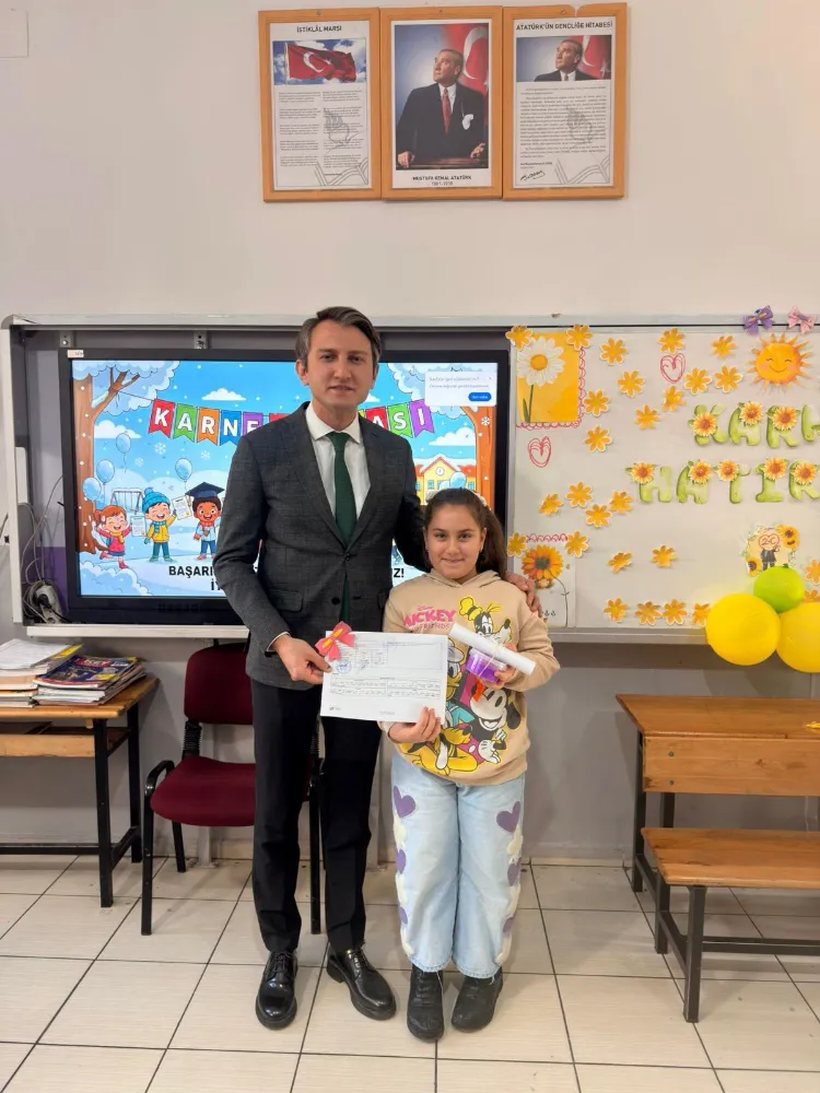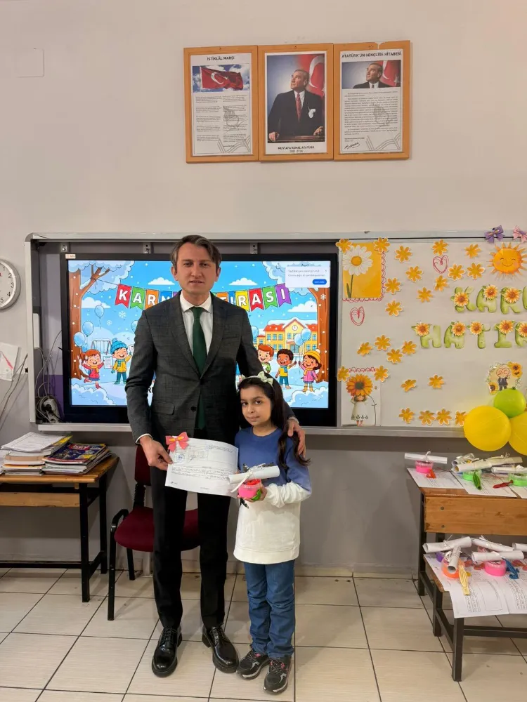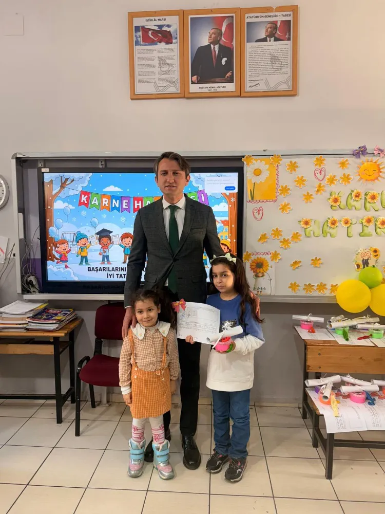 Karne dağıtım töreni kapsamında Fatih Özcan, Cumhuriyet İlkokulu’nda düzenlenen programa katılarak öğrencilerin heyecanına ortak oldu. Sınıfları tek tek ziyaret eden Kaymakam Özcan, öğrencilerle yakından ilgilenerek karnelerini takdim etti.