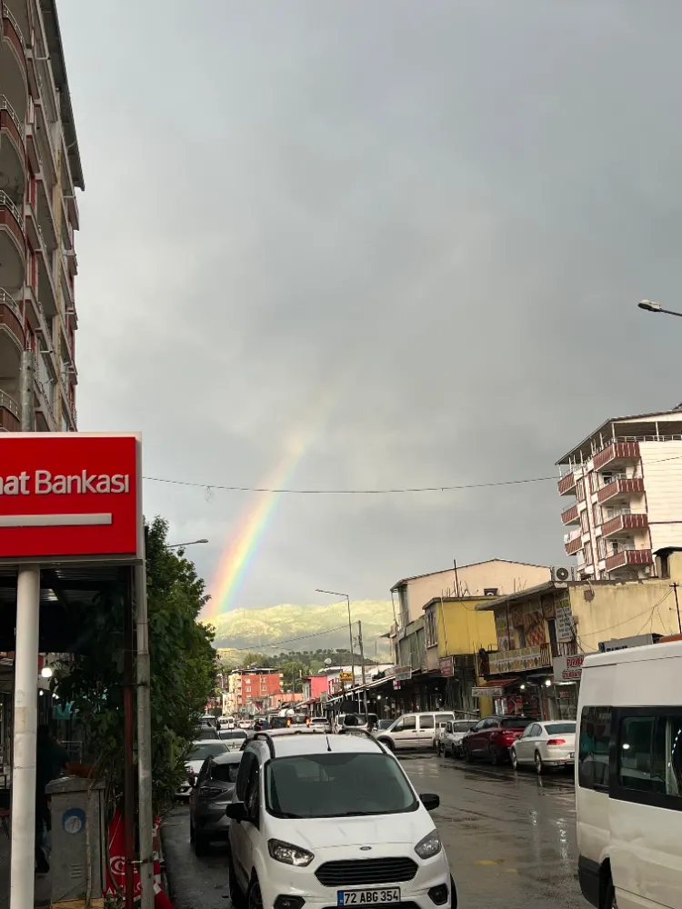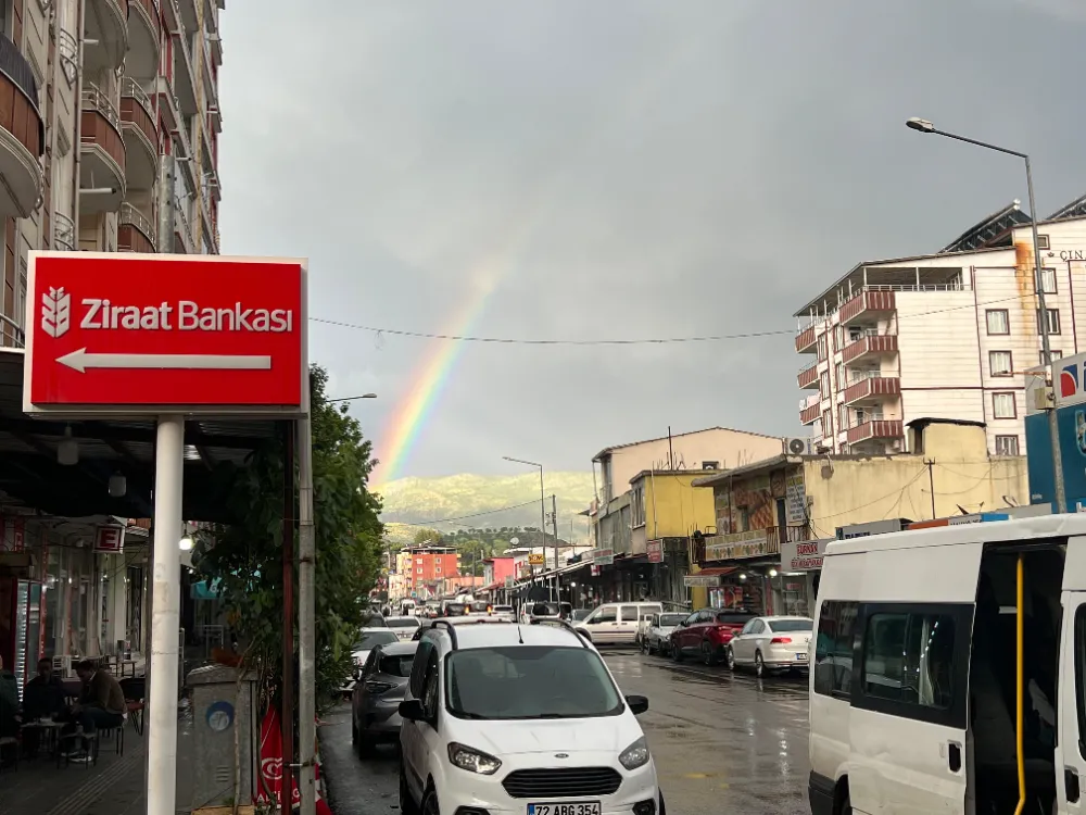Baykan’da bugün etkili olan dolu ve sağanak yağışın ardından semalarda göz alıcı bir gökkuşağı belirdi. Yağışın ardından güneşin yüzünü göstermesiyle birlikte oluşan gökkuşağı, doğanın tüm renklerini yansıtarak izleyenlere görsel bir şölen sundu.