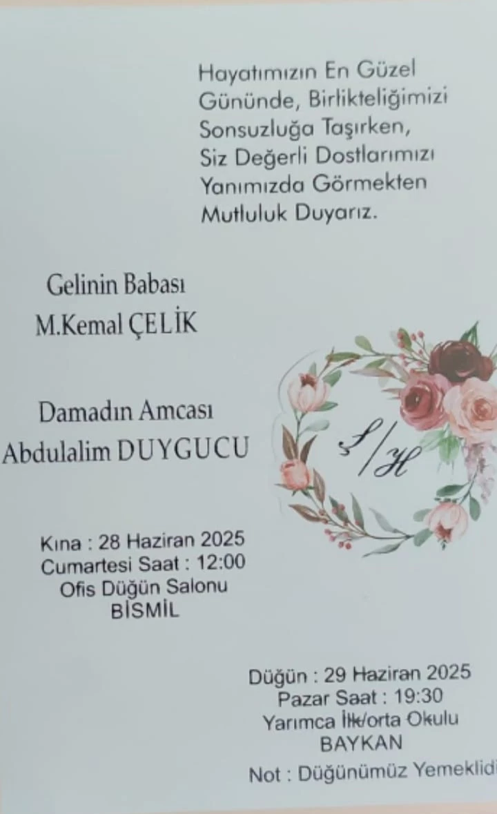 Davetiyede gelinin babası olarak M. Kemal Çelik, damadın temsilcisi olarak ise amcası Abdulalim Duygucu yer aldı.