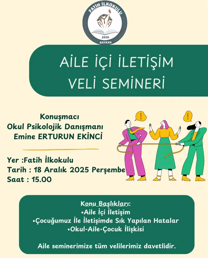 18 Aralık 2025 Perşembe günü saat 15.00’te, Fatih İlkokulu’nda düzenlenecek seminere Okul Psikolojik Danışmanı Emine Erturun Ekinci konuşmacı olarak katılacak. Seminerde; aile içi iletişim, çocuklarla iletişimde sık yapılan hatalar ile okul–aile–çocuk ilişkisi gibi önemli başlıklar ele alınacak.