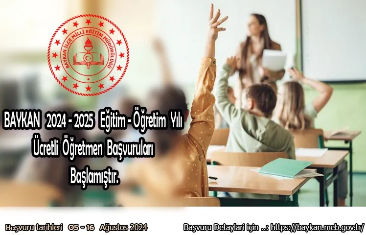 Baykan İlçe Milli Eğitim Müdürlüğü 05-16 Ağustos tarihleri arasında ücretli öğretmenlik başvurularının yapılabileceğini duyurdu.