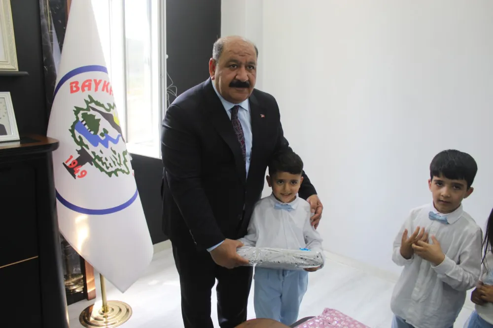 Baykan Belediye Başkanı Ekrem Erdem , 23 Nisan Ulusal Egemenlik ve Çocuk Bayramı dolayısıyla Yumurcaklar Anaokulu öğrencilerini makamında ağırladı. Çocuklar temsili olarak başkanlık koltuğuna oturarak taleplerini iletti.23 Nisan Ulusal Egemenlik ve Çocuk Bayramı dolayısıyla başkanlık koltuğuna Baykanlı minikler oturdu.Baykan Belediye Başkanı Ekrem Erdem , Yumurcaklar Anaokulu'nda eğitim gören öğrencileri makamında ağırladı. 23 Nisan Ulusal Egemenlik ve Çocuk Bayramı etkinlikleri kapsamında düzenlenen ve geleneksel hale gelen, çocukların temsili olarak yönetici koltuğuna oturmaları töreninde, kısa sürede olsa Baykan Belediye Başkanlığı koltuğunu emanet alan çocuklar, istek ve temennilerini Başkan Ekrem Erdem’e ilettiler.Ziyaretin sonunda Baykan Belediye Başkanı Ekrem Erdem, çocuklara çeşitli hediyeler verirken hatıra fotoğrafı çektirdi. Atatürk'ün tüm dünya çocuklarına armağan ettiği 23 Nisan Ulusal Egemenlik ve Çocuk Bayramı kapsamında Baykanlı miniklerle buluşmaktan memnuniyet duyduğunu belirten Başkan Ekrem Erdem, Yarının büyükleri ve yöneticileri olacak yavrularımız, ülkemizi daha güzel günlere taşıyacaklar. Tüm dünya çocuklarının 23 Nisan Ulusal Egemenlik ve Çocuk Bayramı'nı kutluyorum dedi