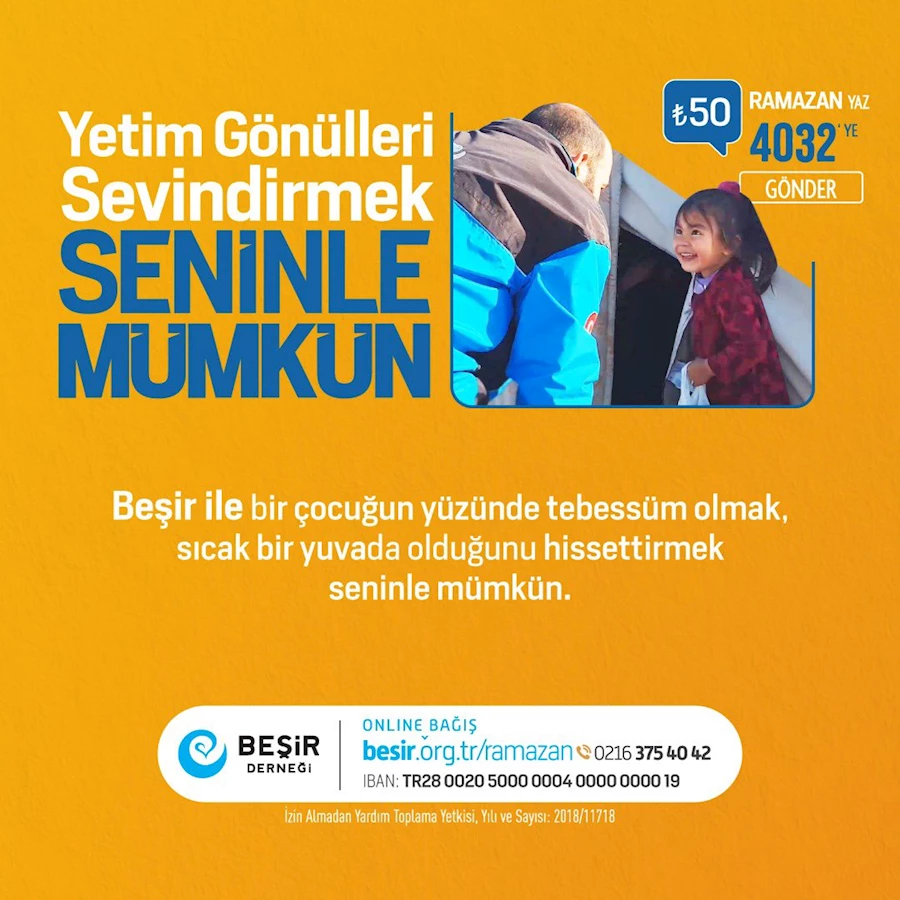 Beşir Derneği Zekat, Fitre, İftar, kumanya, bayramlık bağışı çağrısında bulundu. Beşir Derneği soysal medya hesabından, Zekat, Fitre, İftar, kumanya, bayramlık bağışı çağrısında bulundu. Paylaşımında; Yetim gönülleri sevindirmek, seninle mümkün. Şimdi iyilik vakti. Bağışçılarımız Zekat, Fitre, İftar, kumanya, bayramlık vb. bağışlar için : http://besir.org.tr/ramazan adresini ziyaret edebilir. Yada mesaj yoluyla Fitre Yaz 4066’ya gönder 180₺ ve TR28 0020 5000 0004 0000 0000 19 iban numarası ile bağış işlemlerini gerçekleştirebilir. Sözlerine yer verildi.