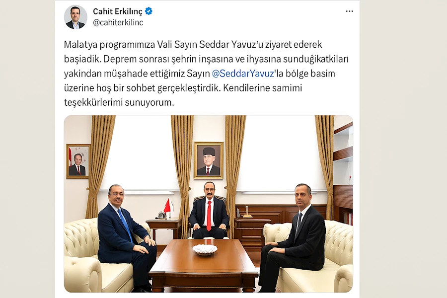 "Malatya programımıza Vali Sayın Seddar Yavuz'u ziyaret ederek başladık. Deprem sonrası şehrin inşasına ve ihyasına sunduğu katkıları yakından müşahade ettiğimiz Malatya Valisi Sayın Seddar Yavuz'la bölge basını üzerine hoş bir sohbet gerçekleştirdik. Kendilerine samimi teşekkürlerimi sunuyorum."