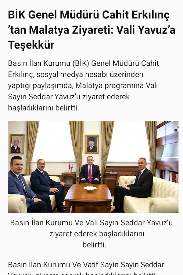 Basın İlan Kurumu (BİK) Genel Müdürü Cahit Erkılınç, sosyal medya hesabı üzerinden yaptığı paylaşımda, Malatya programına Vali Sayın Seddar Yavuz’u ziyaret ederek başladıklarını belirtti.