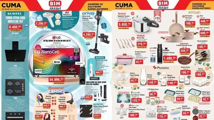 Bu hafta, müşterileri büyük fırsatlar bekliyor. 24 Ocak'ta BİM mağazalarında yer alacak indirimli ürünler arasında lazer epilasyon cihazı, şarjlı dikey süpürge, oyuncu ürünleri, Tefal düdüklü tencere, Emsan tencereler, Paşabahçe bardaklar, bebek ürünleri ve çok sayıda oyuncak gibi çeşitli ürünler bulunuyor. İşte bu Cuma BİM'de sizi bekleyen fırsatlar!