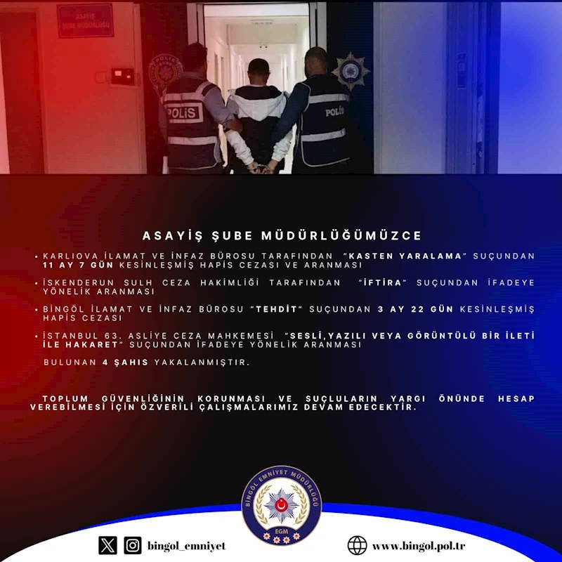 Bingöl İl Emniyet Müdürlüğü tarafından yapılan açıklamada, “Asayiş Şube Müdürlüğümüzce Karlıova İlamat Ve İnfaz Bürosu tarafından ‘Kasten Yaralama’ suçundan 11 ay 7 gün kesinleşmiş hapis cezası ve aranması İskenderun Sulh Ceza Hakimliği tarafından ‘İftira’ suçundan ifadeye yönelik aranması, Bingöl İlamat Ve İnfaz Bürosu ‘Tehdit’ suçundan 3 ay 22 gün kesinleşmiş hapis cezası İstanbul 63. Asliye Ceza Mahkemesi ‘Sesli,Yazılı veya Görüntülü Bir İleti İle Hakaret’ suçundan ifadeye yönelik aranması bulunan 4 şahıs yakalanmıştır" denildi.