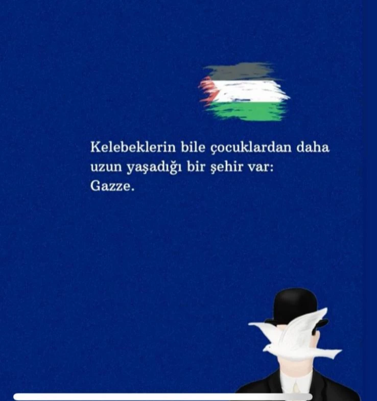 İkinci görsel ise yürek burkan başka bir gerçeği gözler önüne seriyor. Üzerinde Filistin bayrağı olan arka fonda yer alan cümle, “Kelebeklerin bile çocuklardan daha uzun yaşadığı bir şehir var: Gazze.” ifadesiyle, masumiyetin acı sonunu dile getiriyor. Gazze’de çocuk olmak, bir kelebeğin ömründen daha kısa sürebilen bir hayal artık…