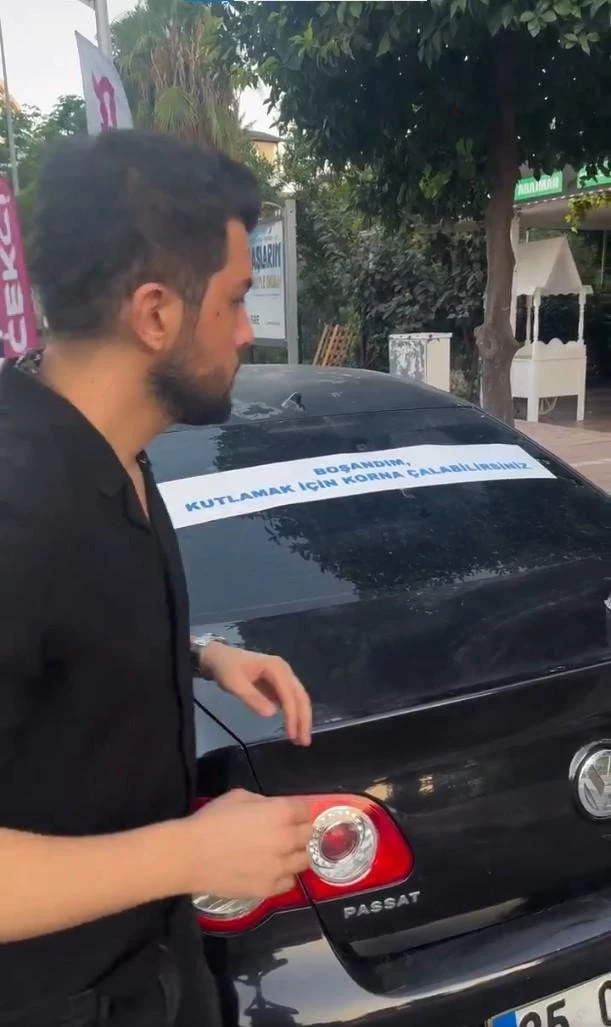 İzmir'de eşinden boşanan bir adam, aracının arkasına astığı pankartla sosyal medyada gündem oldu.