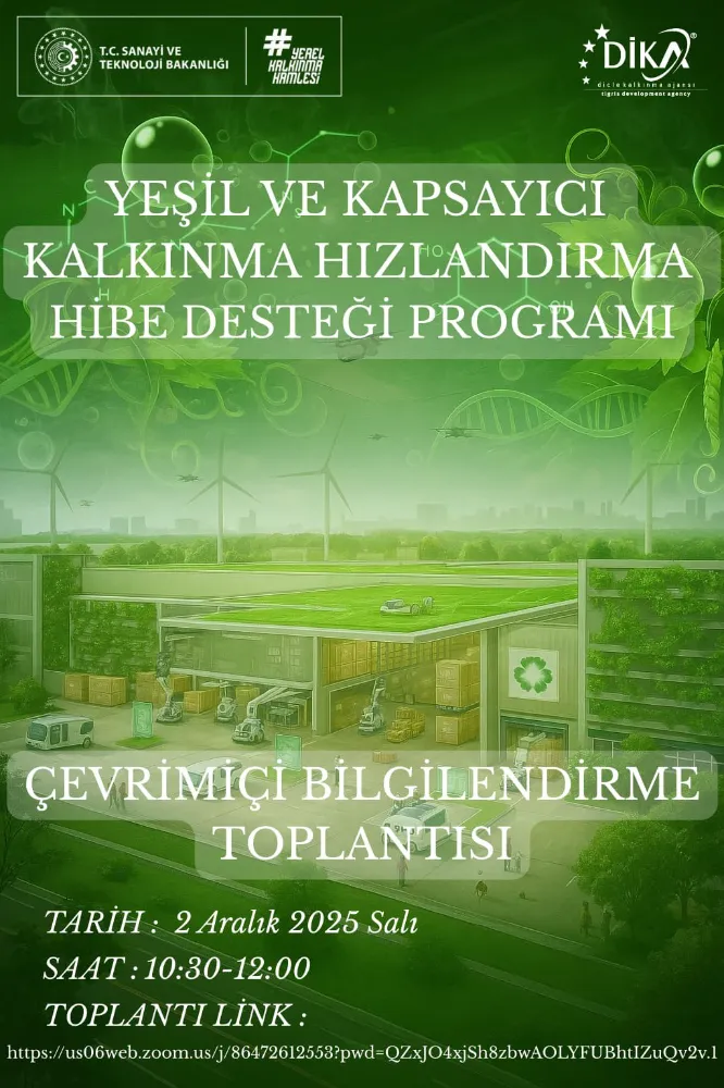 Dicle Kalkınma Ajansı (DİKA) tarafından duyurulan “Yeşil ve Kapsayıcı Kalkınma Hızlandırma Hibe Desteği Programı” kapsamında, başvuru şartları, destek kapsamı ve süreçlere ilişkin detayların paylaşılacağı çevrimiçi bilgilendirme toplantısı 2 Aralık 2025 Salı günü gerçekleştirilecek.