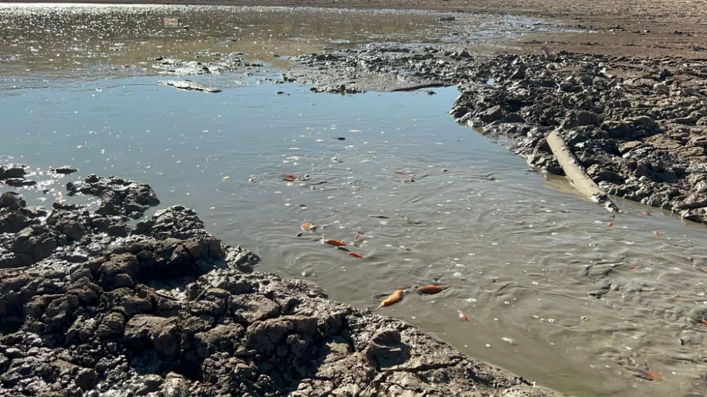 Gölet tabanında oluşan balçıkta mahsur kalan çok sayıda balık, itfaiye ekiplerinin hızlı müdahalesiyle yeniden suya salındı.