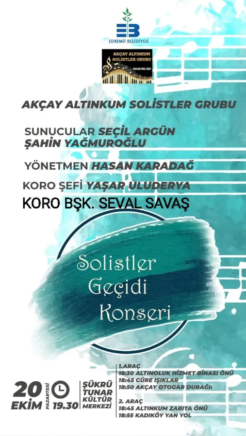 Edremit Belediyesi’nin ev sahipliğinde, Akçay Altınkum Solistler Grubu tarafından düzenlenecek olan “Solistler Geçidi Konseri” 20 Ekim 2025 Pazartesi günü saat 19.30’da Şükrü Tunar Kültür Merkezi’nde sanatseverlerle buluşacak.