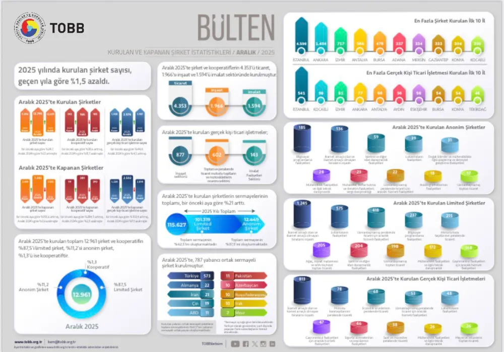 2025 yılında kurulan şirket sayısı, 2024 yılına göre %1,5 azaldı. Aynı dönemde: