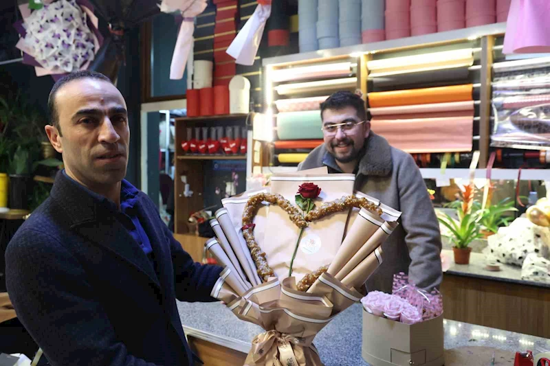 Elazığ’da bir çiçekçi, 14 Şubat Sevgililer Günü’ne özel olarak cevizli sucuktan (orcik) buket yaparak farklı bir hediye alternatifi sundu.