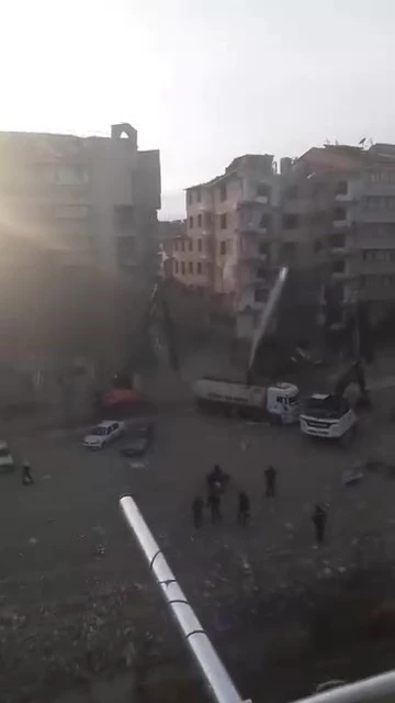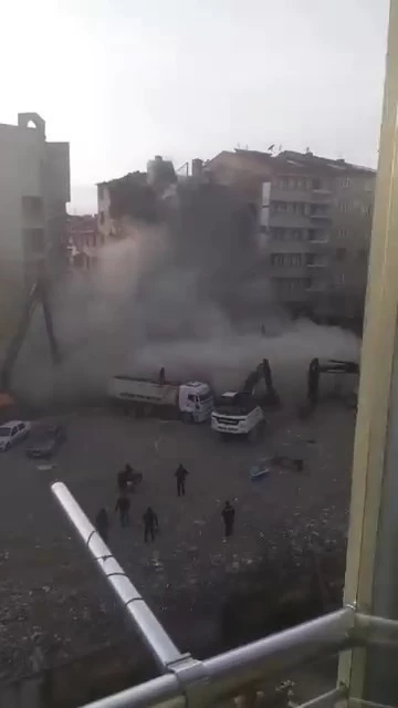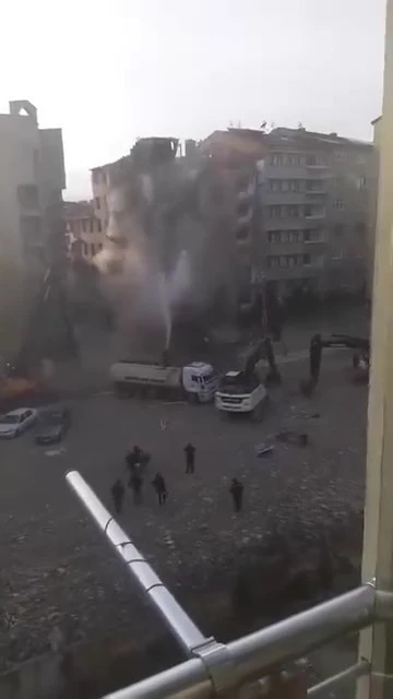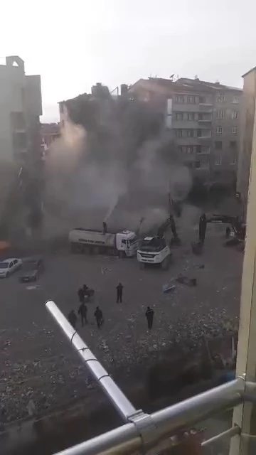 6 Şubat’ta Kahramanmaraş’ta meydana gelen yıkıcı depremlerden etkilenen iller arasından bulunan Elazığ’da ağır hasarlı binaların yıkımı devam ediyor. Bu çerçevede, merkeze bağlı Rızaiye Mahallesi’nde yıkımına başlanan 7 katlı bina, iş makinesinin makasını vurmasıyla bir anda yerle bir oldu. Ortalık toz bulutu ile kaplanırken o anlar cep telefonu kamerasına saniye saniye yansıdı.
