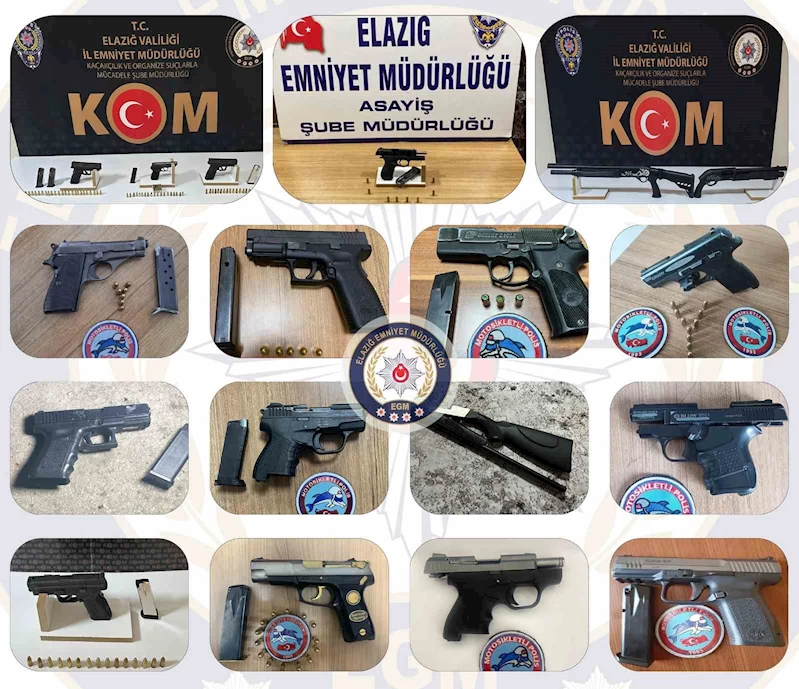 Elazığ İl Emniyet Müdürlüğü Elazığ Cumhuriyet Başsavcılığı koordinesinde genel güvenlik ve genel asayişin sağlanması, suça konu unsurların tespiti ve şüpheli şahısların yakalanmasına yönelik Asayiş, Narkotik ve KOM birimlerince il merkezinde operasyon düzenlendi. Düzenlenen operasyonlarda 39 şüpheli şahıs yakalanarak gözaltına alındı. Yapılan aramalarda 15 adet ruhsatsız tabanca ve tabancalara ait 191 adet fişek, 5 adet pompalı tüfek ve 8 adet kartuş, 4 parça halinde 320.87 gram esrar maddesi, 7 parça halinde 107,17 gram sentetik kannabinoid maddesi, 3 parça halinde 60,79 gram metamfetamin maddesi, 6 adet sentetik ecza maddesi ele geçirildi.