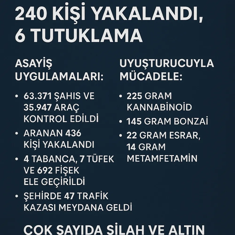 Elazığ Valiliği, 23-29 Haziran tarihleri arasındaki asayiş ve güvenlik uygulamalarının bilançosunu açıkladı. Son bir haftada kent genelinde 247 olay meydana geldi, bu olaylarla bağlantılı olarak 240 kişi yakalandı, 6 kişi ise tutuklanarak cezaevine gönderildi.