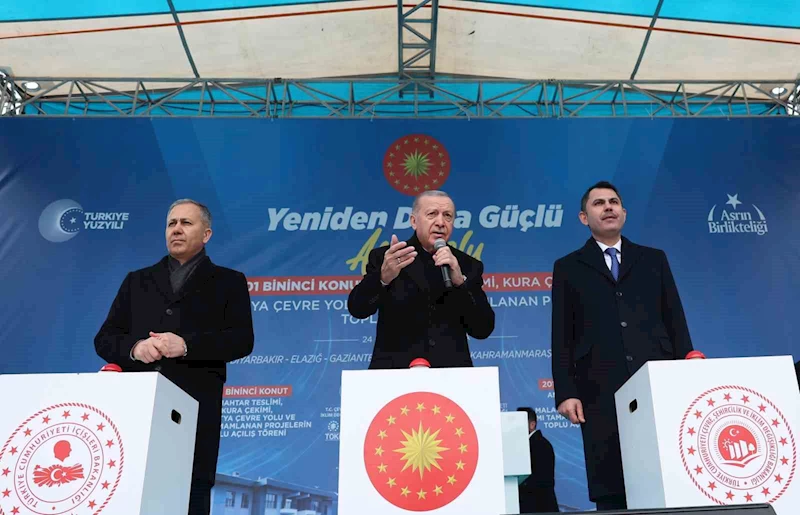 Cumhurbaşkanı Erdoğan, depremzedelere yapılan konut teslimatlarının devam ettiğini belirterek, "Bugün Hatay’da 13 bin 980, Adana’da 2 bin 945, Gaziantep’te bin 535, Diyarbakır’da 822, Elazığ’da 3 bin 353, Adıyaman’da 6 bin 781, Kahramanmaraş’ta 7 bin 202, Şanlıurfa’da 991, Kilis’te 223, Osmaniye’de bin 921 ve Malatya’da 6 bin 554 olmak üzere toplamda 46 bin 307 yuvamızı hak sahipleriyle buluşturuyoruz. Böylece 11 ilimizde toplam 201 bin 431 bağımsız bölümü afetzedelerle teslim etmiş oluyoruz. 2025 yılı sonuna kadar, Malatya’da 68 bin 706 konut ve 10 bin 714 işyeri olmak üzere toplamda 79 bin 420 konut ve işyerini teslim edeceğiz. Deprem bölgemizde ise 452 bin 983 bağımsız bölümü vatandaşlarımıza teslim etmiş olacağız. İnşallah yıl bitmeden, deprem bölgesindeki 11 ilimizde tüm vatandaşlarımız huzurlu, güvenli yeni yuvalarına kavuşacak, iş yerini açmayan tek bir depremzede kalmayacak” şeklinde konuştu.