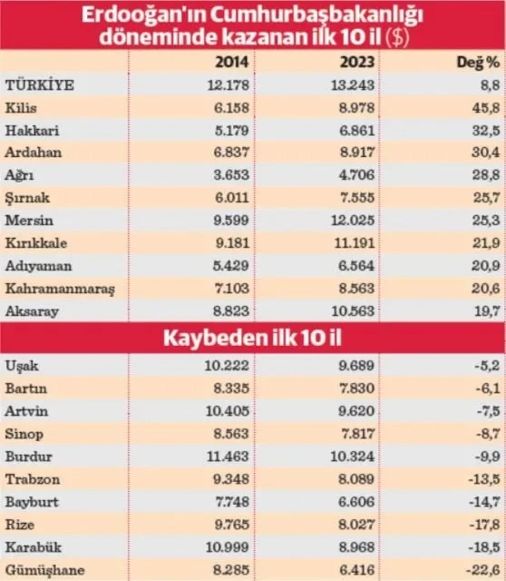2014-2023 döneminde Türkiye’de kişi başına düşen gelir %8,8 artarak 12.178 dolardan 13.243 dolara yükseldi. Ancak bu dönemde özellikle ülke ortalamasının altında kalan bazı iller, gelir artışıyla dikkat çekti: