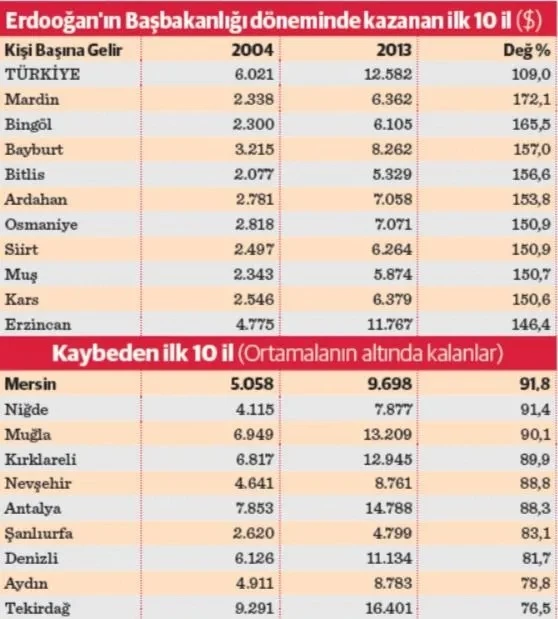 Erdoğan’ın Cumhurbaşkanlığı döneminde bazı iller ekonomik olarak geriye gitti. Gelirin en fazla düştüğü iller şöyle sıralandı:
